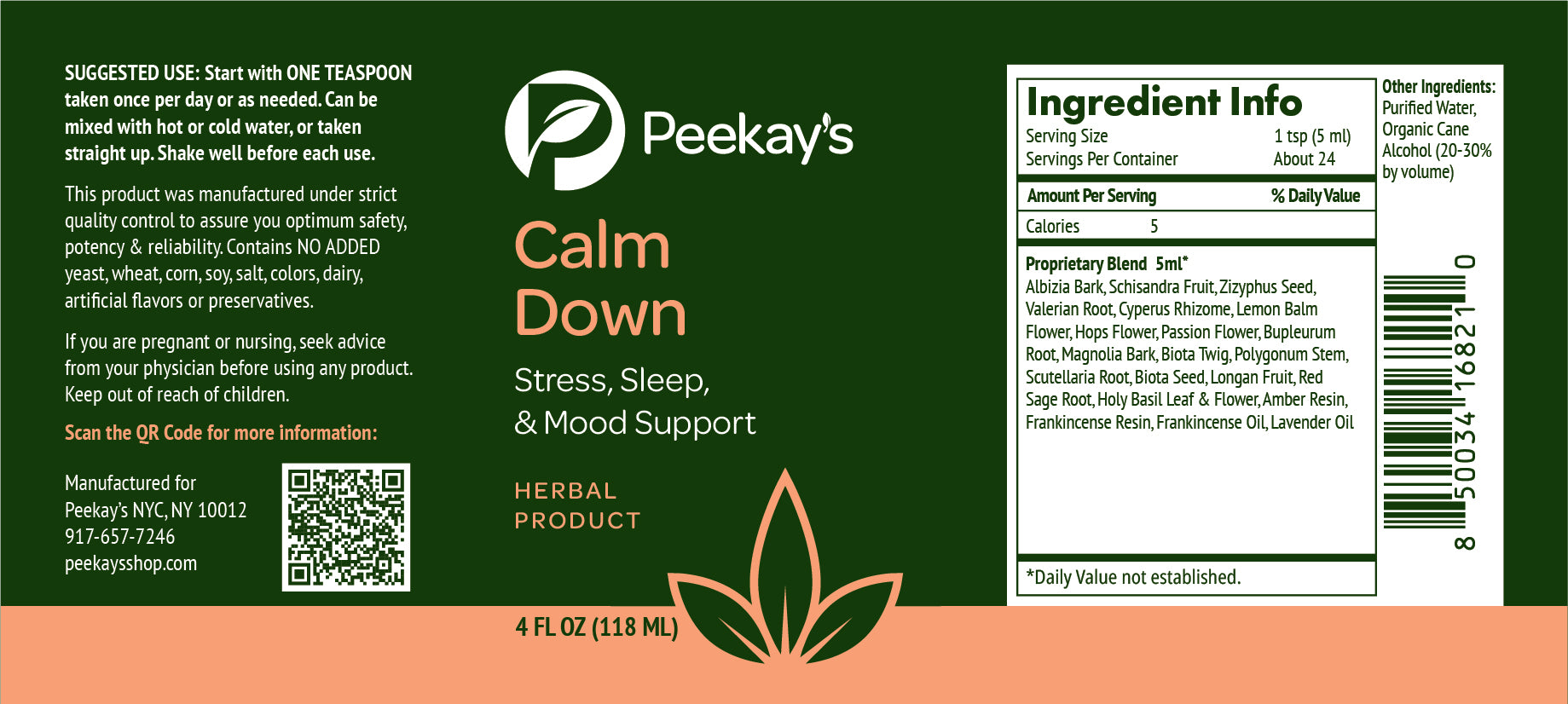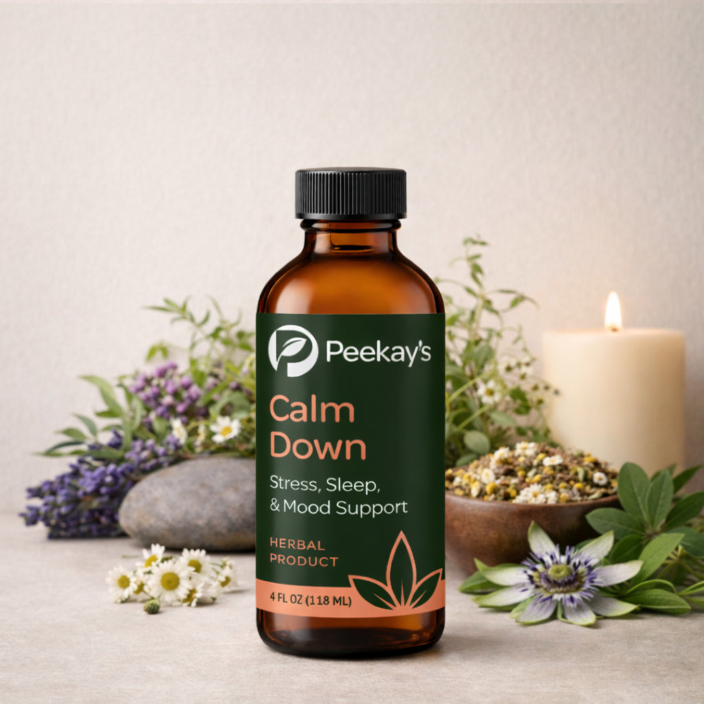 Peekay’s Calm Down is for the person who is just so stressed they are “tired but wired”, can’t sleep, overwhelmed, having anxiety or panic attacks, trying to avoid or tapering off prescription sleep, anxiety or pain meds. Especially for people with a high stress job, social anxiety, for parents…anyone who would benefit from a seriously calming, grounding and nourishing formula.*