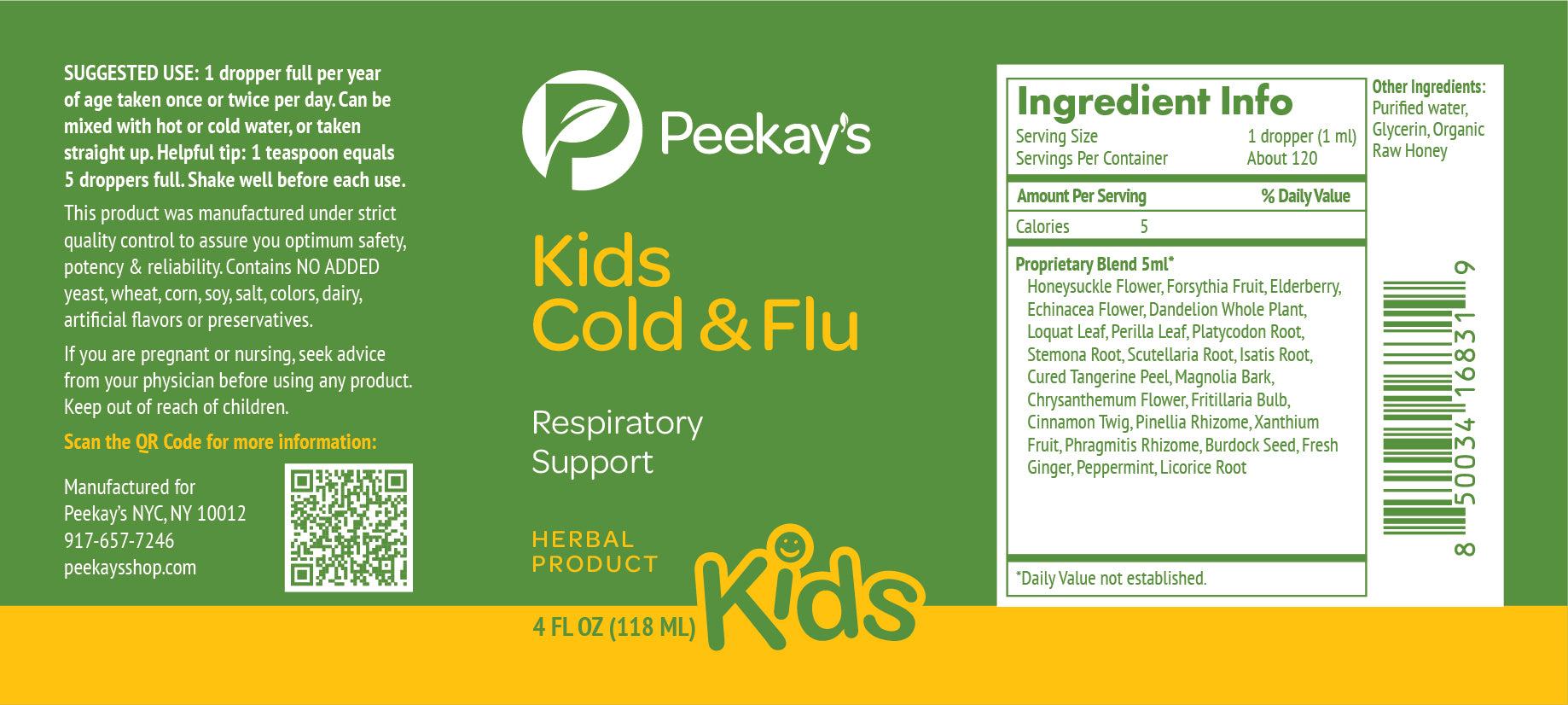Peekay’s Kids Cold & Flu contains herbal ingredients that have both anti-viral and anti-bacterial properties. It also has ingredients that support reduction of phlegm, mucus and congestion, cough, sore throat, and other common signs and symptoms of upper respiratory infections in children. Kid’s Cold & Flu also contains herbs that support immune function.*